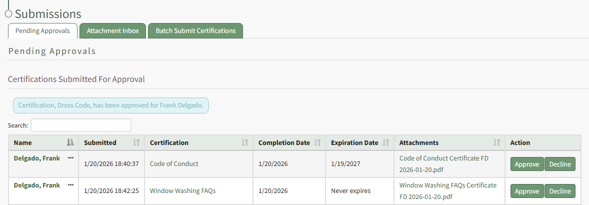 A text box confirms that the certification was approved, and it is no longer visible on the Pending Approvals Tab.