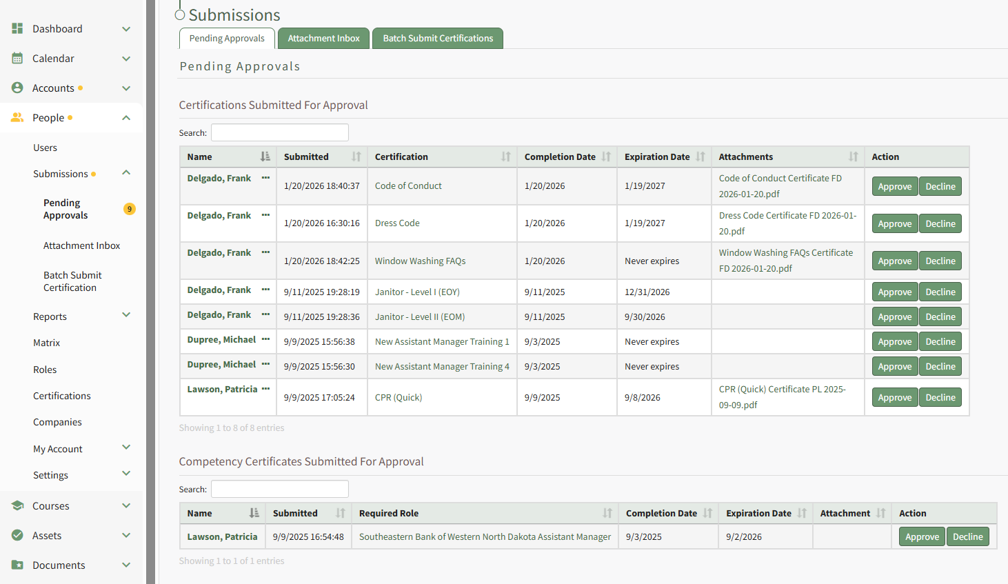 To approve a submitted certification that is pending approval, open the Pending Approvals Tab on the Submissions Page in the People Module from the Main Menu.
