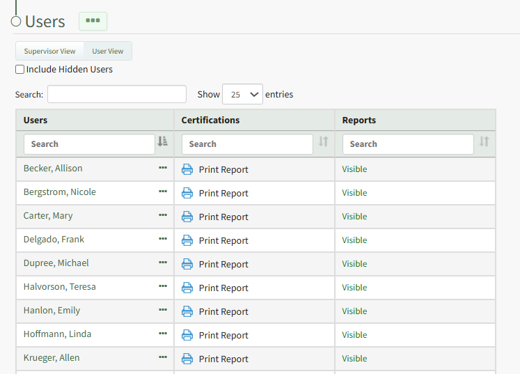 To easily approve multiple certifications that have been submitted for a specific user, open the Users Page in the People Module from the Main Menu. Click the name of the individual in the Users column whose certifications you want to approve.