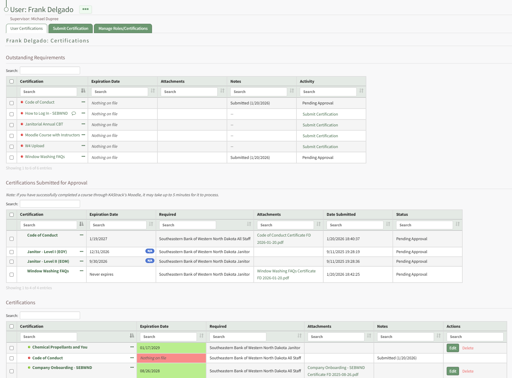 This opens the user's Certifications Details Page. Certifications pending approval are displayed in the Certification Submitted for Approval Section.