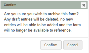 Selecting “Archive Form” will open a confirmation modal stating, “Are you sure you wish to archive this form? Any draft entries will be deleted, no new entries will be added and the form will no longer be available to reference.”