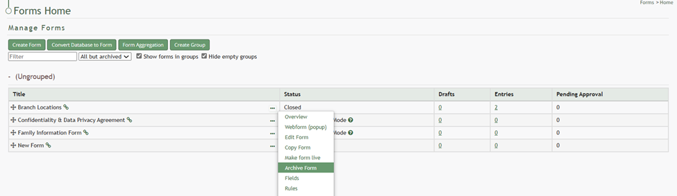 To archive a closed form, go to the Home Page of the Forms Module and click the three-dot icon to the right of the form that you wish to archive. This opens the Form’s context menu. Select “Archive Form”.