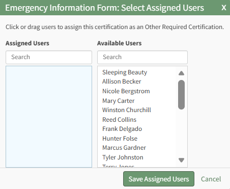 Clicking the name of a user will move them from the available to assigned column, and vice versa. After assigning the appropriate available users, select the Save Assigned Users button.