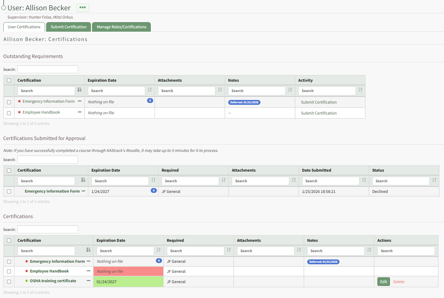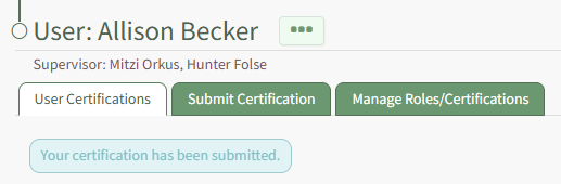 A textbox beneath the User Certification Tab confirms that your changes were submitted.