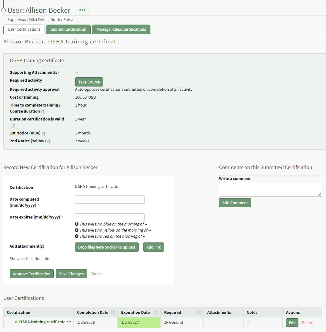 To attach a file or link to a supervised user's certification, open the Users Page in the People Module and click the name of the user whose certification you want to attach a file or link to, opening the user's Certifications Details Page.