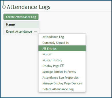 To edit the columns that show on the All Entries Table, open the attendance log you want to make changes in. You can access an attendance log on the Main Menu (if selected to be shown there) or from the Home Page of the Attendance Module.