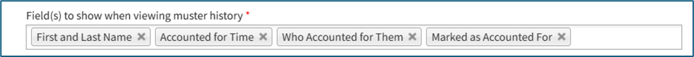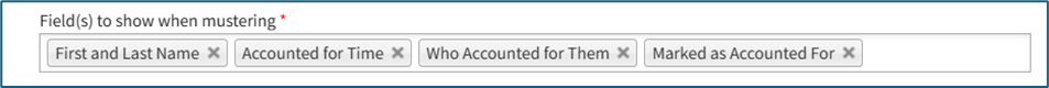 Fields to Include on the display page when mustering | Select the fields you would like to be visible on the Mustering Display Page. All fields included on the attendance log form will show as options. | ||
