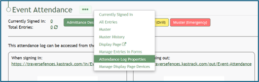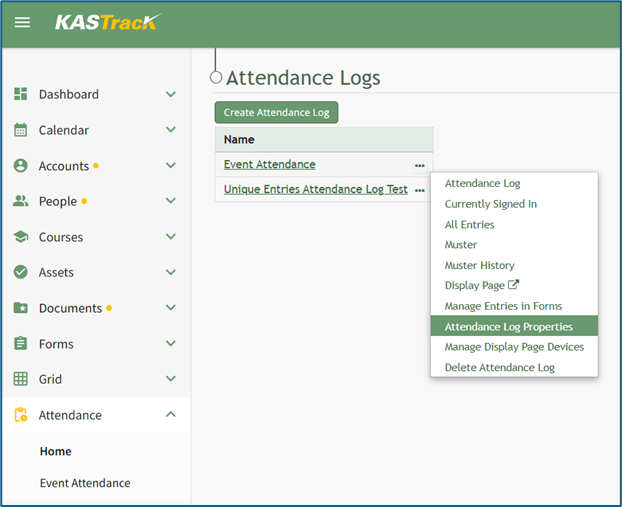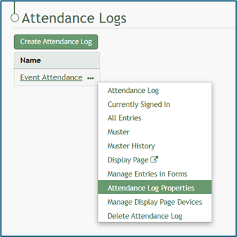 To enable the Admittance Desk Page for an attendance log, open the attendance log you wish to enable the Admittance Desk feature in by going to the Home Page of the Attendance Module and clicking the three-dot icon to the right of an attendance log’s name, opening the context menu. Select “Attendance Log Properties” from the context menu which will open the Edit Attendance Log Modal.