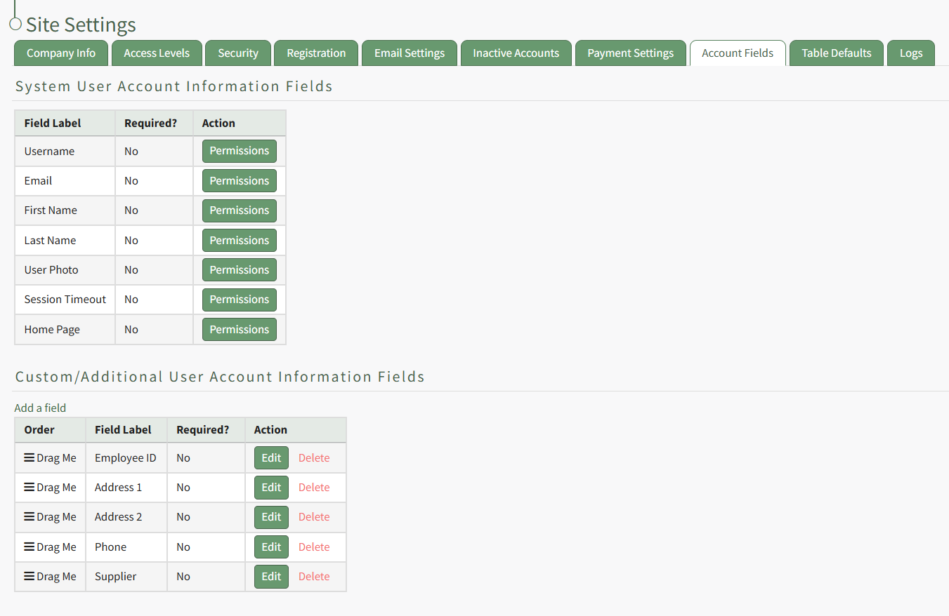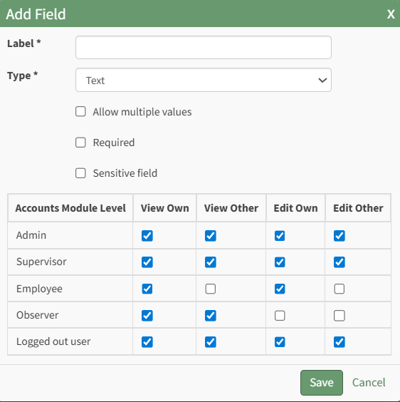 The Permissions Table determines who can view / edit their own and other user's fields. Selecting the checkbox gives the individual the specified permission. Deselecting the checkbox removed the permission.