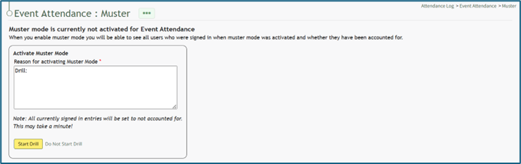 Input the appropriate notes for activating muster mode. The textbox for notes already indicates that this is a drill. Once including additional reasoning, select the yellow “Start Drill” button. The page being displayed changes, and the summary information at the top of the Muster Page indicates that Muster Mode has been initiated.