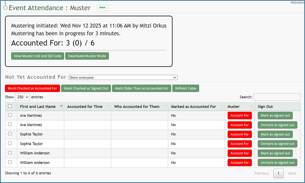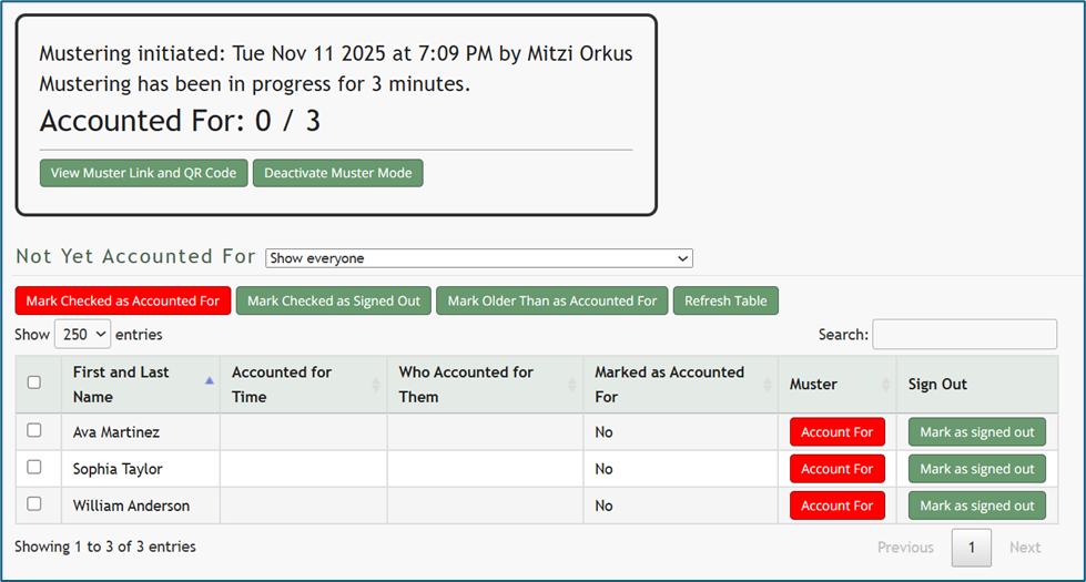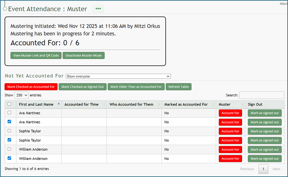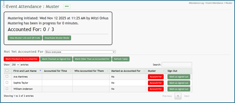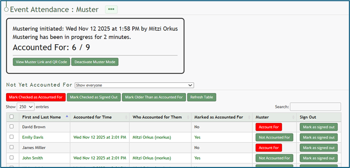 Once muster mode has been activated, individuals who signed in prior to a specific date and time can be marked as accounted for.