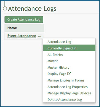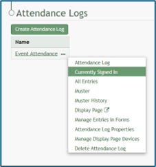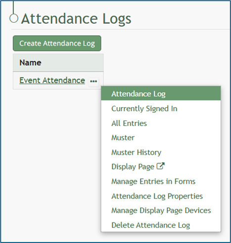 To edit the Display Page for an Attendance Log, open the attendance log you’ve enabled the Display Page feature in by going to the Home Page of the Attendance Module and clicking the three-dot icon to the right of the attendance log title, opening the context menu.