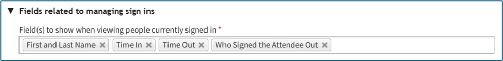 Add and remove fields as desired in the field named “Field(s) to show when viewing people currently signed in”. The order of the fields here corresponds to the order of the columns in the Currently Signed In Table.