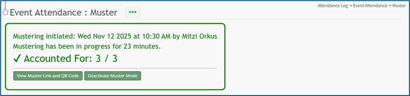 Once Emergency Muster has been activated, the page will change. The muster summary at the top of the page communicates that muster mode has been initiated.