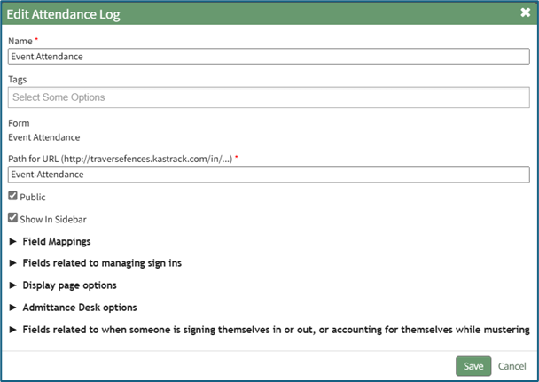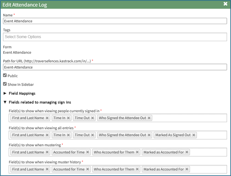 The Edit Attendance Log Modal has five different sections: Field Mappings*, Fields Related to Managing Sign Ins*, Display Page Options, Admittance Desk Options, and Fields Related to When Someone is signing themselves in or out (or accounting for themselves while mustering) *.