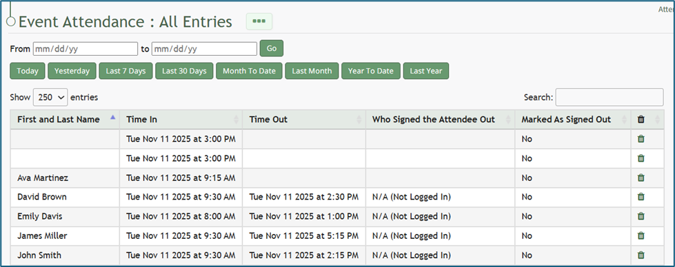 Select “Save” at the bottom of the Edit Attendance Log Modal, and you can check your edits on the All Entries Page.