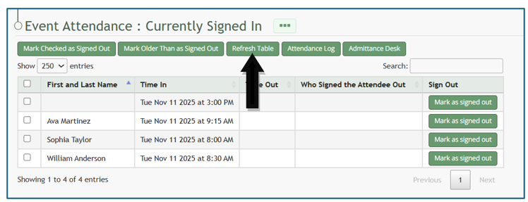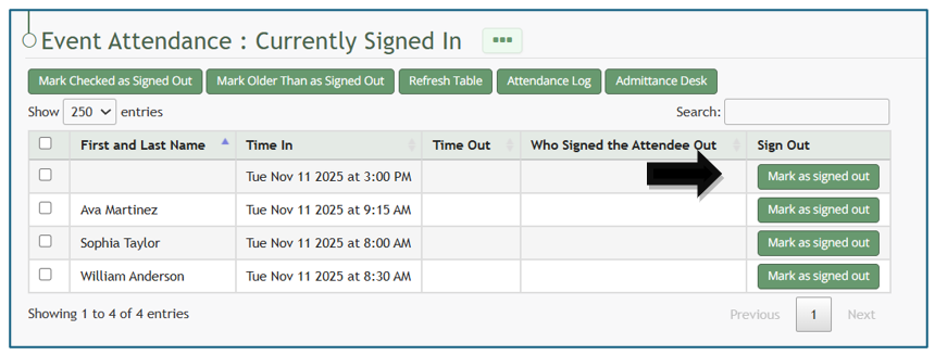 Click the “Mark as Signed Out” button in the row of the entry you wish to be signed out.