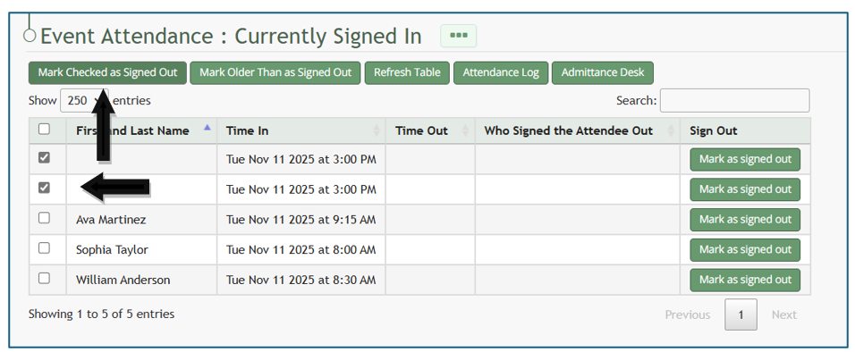 After selecting individuals to be signed out, click the “Marked Checked as Signed Out” button.