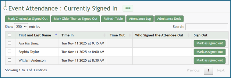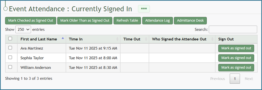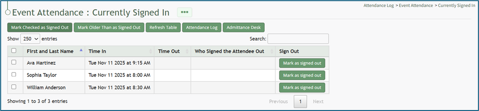 Select “Save” at the bottom of the Edit Attendance Log Modal and your edits will now show on the Currently Signed In Page.