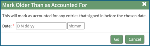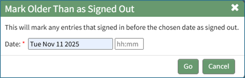 Select the “Mark Older Than as Signed Out” button, opening the Mark Older Than Modal. Click within the date box and a calendar appears for ease in selecting the appropriate date.