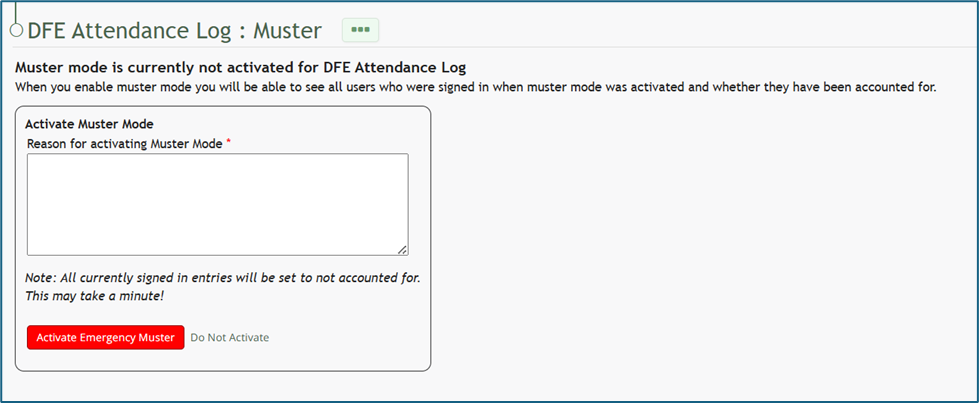 Input any relevant information into the “Reason for Activating Muster Mode” textbox and click the red “Activate Emergency Muster” button.