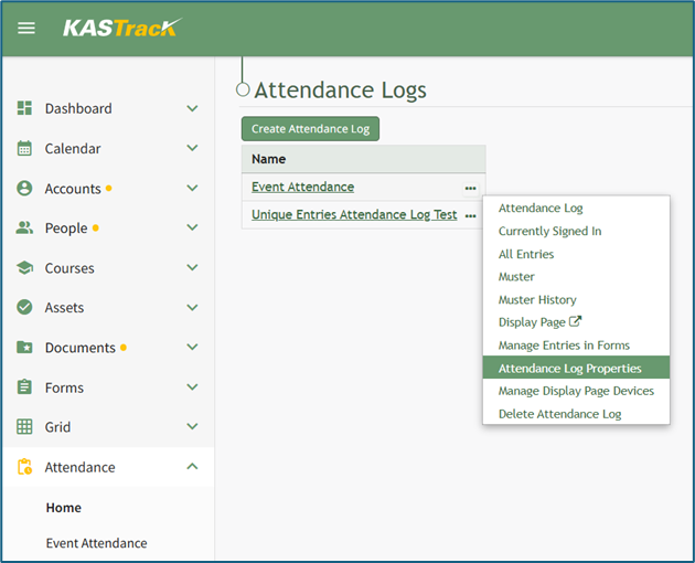 Click on the three-dot icon to the right of the attendance log’s name, which opens the context menu. Then, select “Attendance Log Properties.”