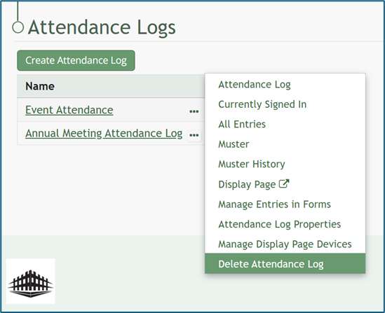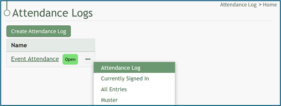 To sign out an individual from the attendance log, open the attendance log you wish to sign individuals out of by going to the Home Page of the Attendance Module and clicking the three-dot icon to the right of the attendance log’s name, opening the context menu.