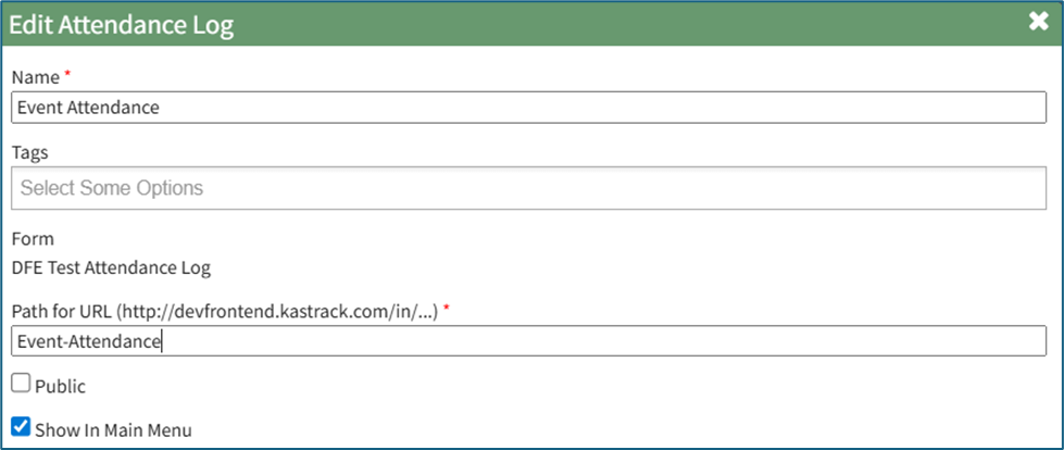 This opens the Edit Attendance Log Modal. Select the “Show In Main Menu” checkbox.