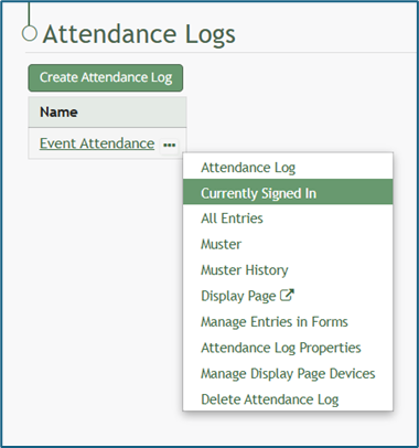 To mark specific entries prior to a date/time as signed out, go to the Home Page and select the three-dot icon to the right of the attendance log you wish to sign out entries for. This opens the context menu. Select “Currently Signed In”.