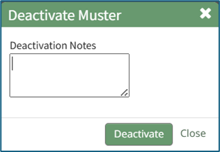 Select the “Deactivate Muster Mode” button, opening the Deactivate Muster Modal. Input any desired Deactivation Notes in the textbox provided.