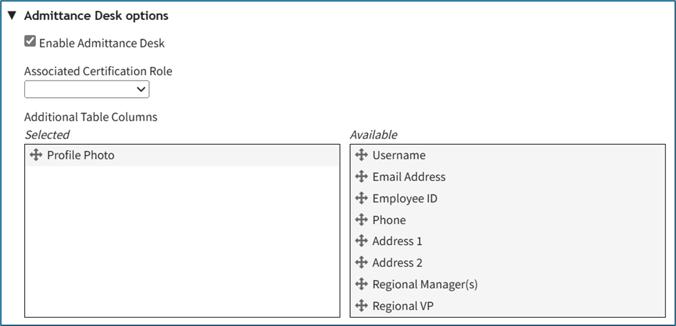 Select the “Enable Admittance Desk” checkbox. Now you can select the Associated Certification Role, and drag and drop any additional columns you want to see on the table. (Note: The available columns are based on your site’s account and custom account fields).