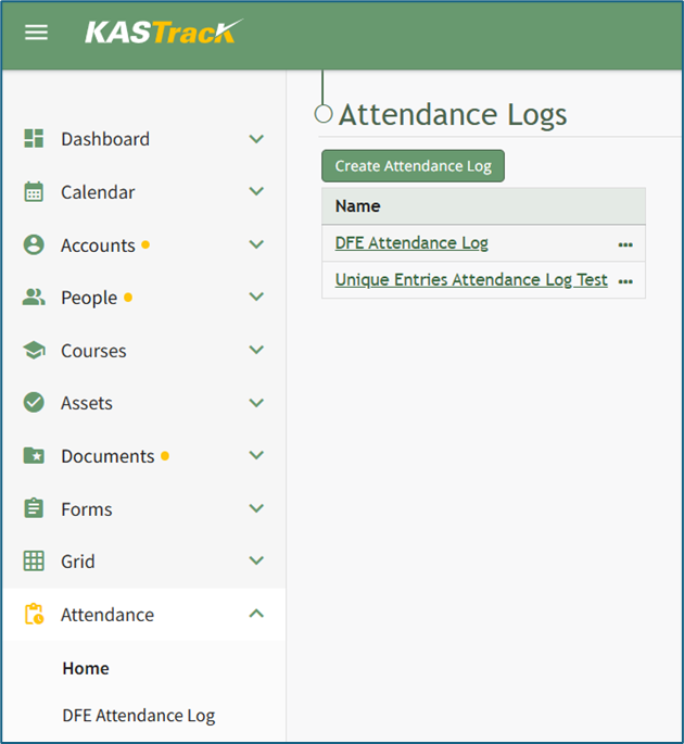 To see the attendance log as its own page in the Main Menu, refresh the page or log out and sign back in to KAStrack. The attendance log will now show as its own page in the Main Menu.