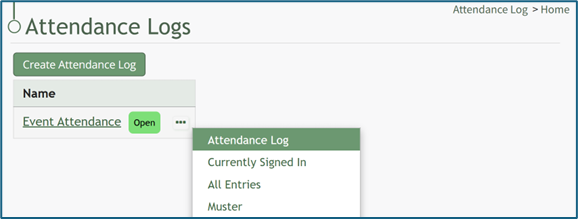 To copy an attendance log’s Sign In, Sign Out, or Muster Link, go to the Home Page of the Attendance Module. Click the attendance log’s name or click the three-dot icon to the right of the specific attendance log, opening the context menu.