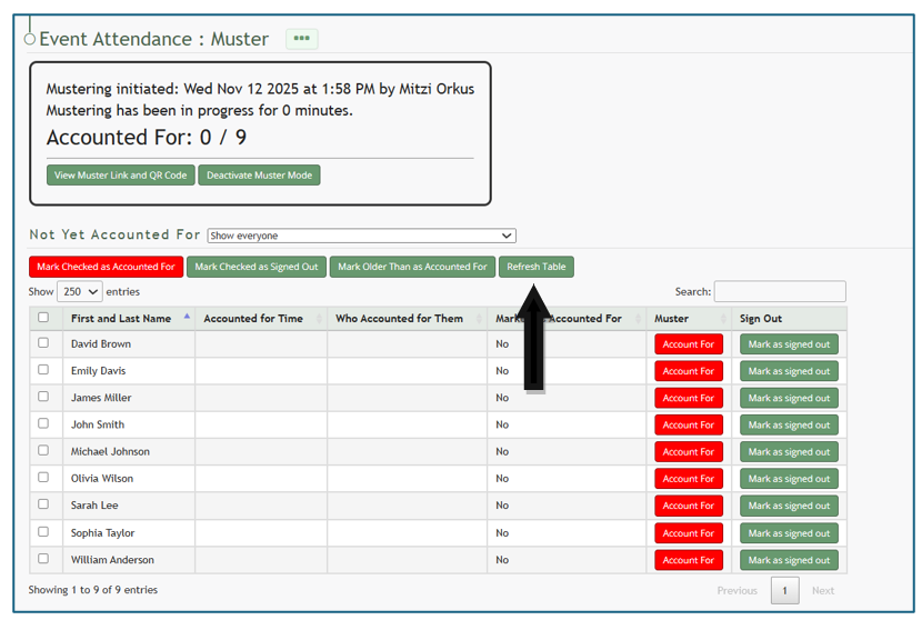 Refreshing the Muster table while in muster mode is a beneficial feature, particularly if individuals are using the QR Code or URL Link to account for themselves.
