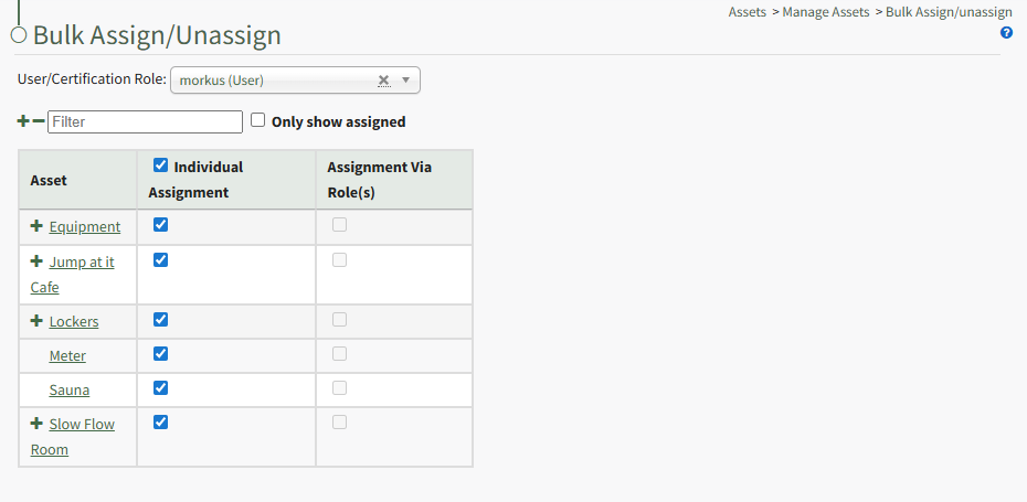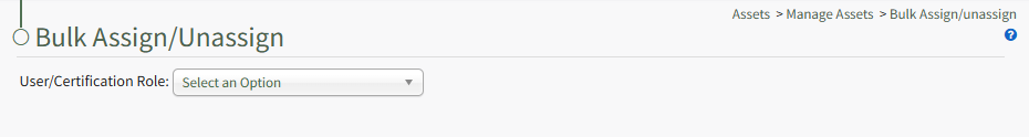 From the User/Certification Role dropdown menu, select the individual user or certification role that you wish assign/unassign assets to. The Bulk Assignment Table is now visible.