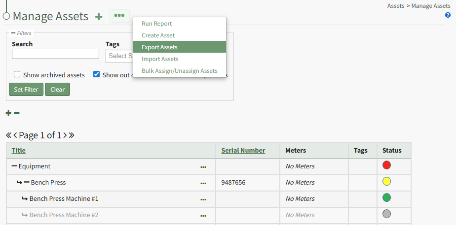 To bulk export asset information as a .csv file, select the Manage Assets Page from the Main Menu in the Assets Module and click the three dot (…) icon to the right of the page header opening the Manage Assets Page Context Menu.