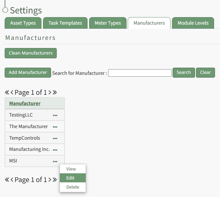 To edit the name of a manufacturer, go to the Manufacturers Tab on the Settings Page of the Assets Module. Select the three-dot icon to the right of the manufacturer whose name you wish to change.