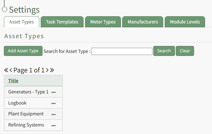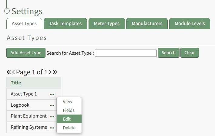 To change an Asset Type name, go to the Asset Type Tab on the Settings Page of the Assets Module. Click the three-dot icon to the right of the Asset Type whose name you wish to change, opening the Asset Type Context Menu.