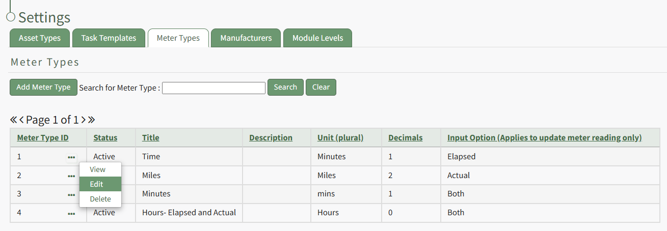 To change the status of a meter type, go to the Meter Types Tab on the Settings Page of the Assets Module. Select the three-dot icon to the right of the meter type ID whose status you want to change opening the Meter Types Context Menu.