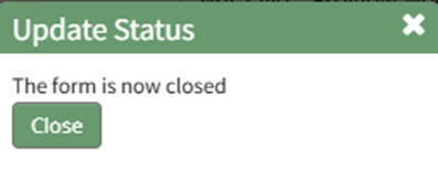 Select “Confirm” and an Update Status Modal appears stating, “The form is now closed.”