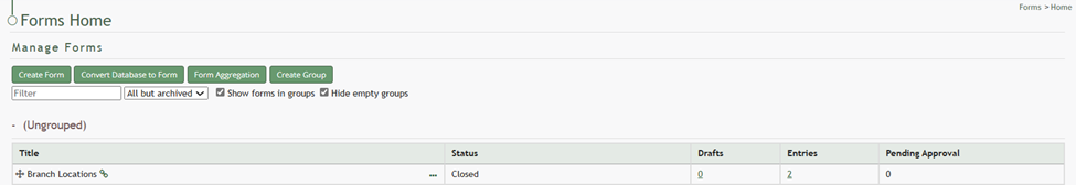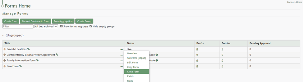 To close a live form, go to the Home Page of the Forms Module and click the three-dot icon to the right of the form that you wish to close. This opens the Form’s context menu. Select “Close Form”.