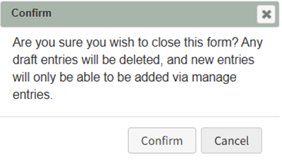 This opens the Close Form Confirmation Modal which states, “Are you sure you wish to close this form? Any draft entries will be deleted, and new entries will only be able to be added via manage entries.”
