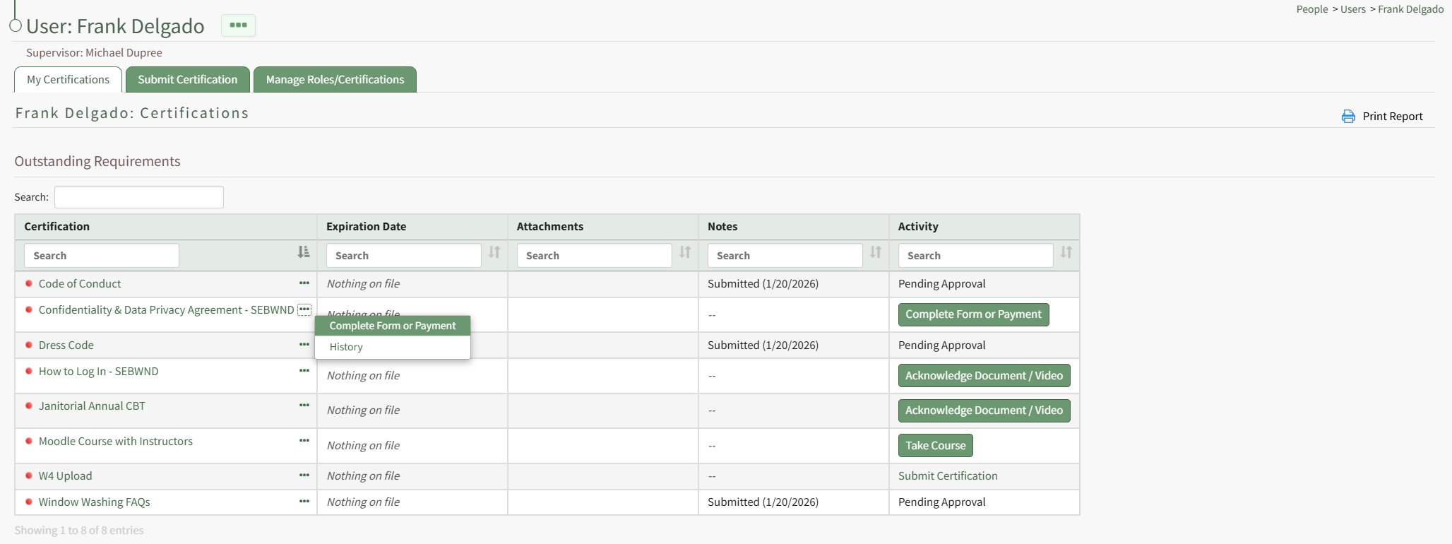 Complete Form or Payment is a context menu open as well as a button in the Activity column on a user's My Certifications Tab on the My Account Page of the People Module. It is also a clickable link in the Required Activity column on a User's Certifications Page.