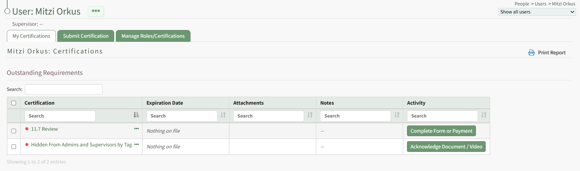 The certification that required a payment will be visible in the Outstanding Requirements Table. Select the Complete Form or Payment button in the Activity column to the right of the certification opening the Complete Payment Modal.