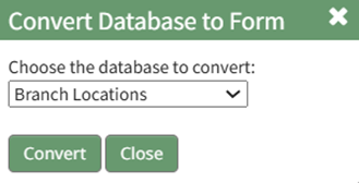 All available databases will in a dropdown menu. Select the database you wish to convert to a form and click the “Convert” button. A confirmation modal will appear stating, “The database has been converted.”