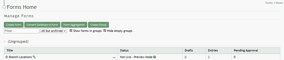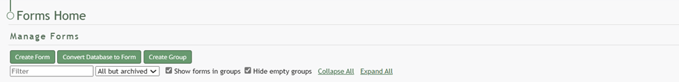 To convert a database to a form, go to the Home Page of the Forms Module. Select the “Convert Database to Form” button beneath the Manage Forms header.