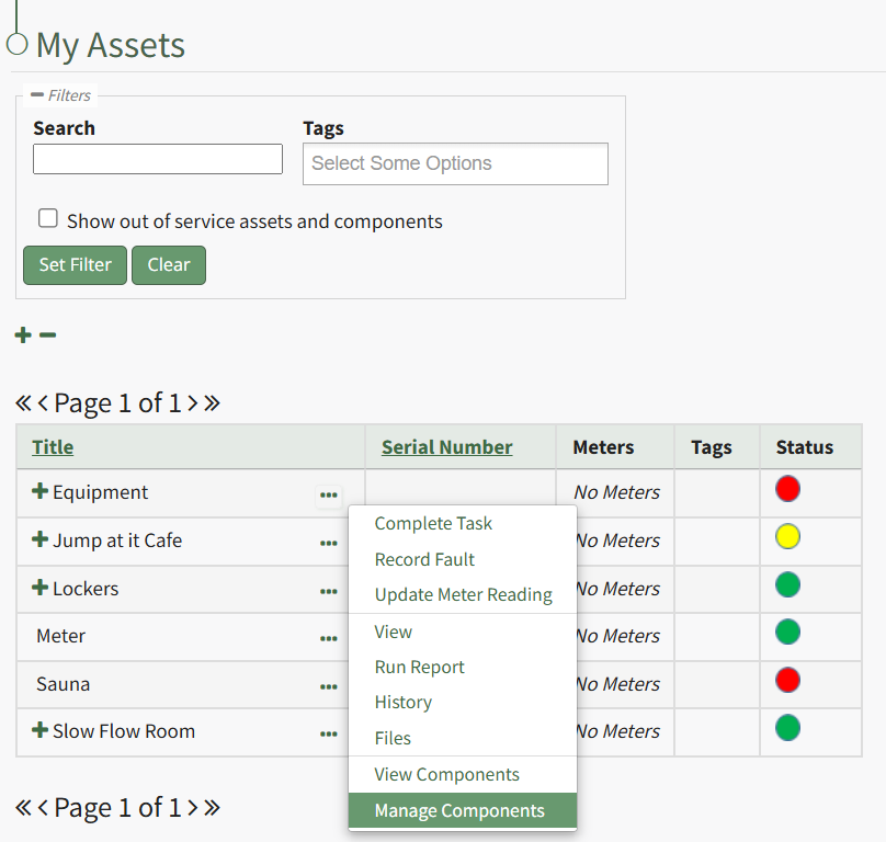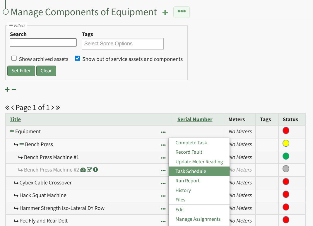 To view an asset's task schedule, open the Manage Assets Page in the Assets Module on the Main Menu. Use filters as needed and identify the asset/component whose task schedule you wish to view. Click the three-dot icon to the right of the asset title opening the Asset Management Context Menu.
