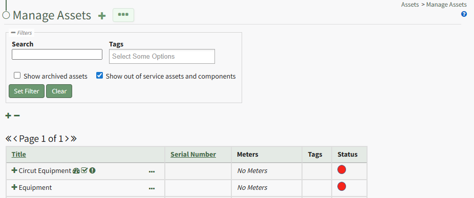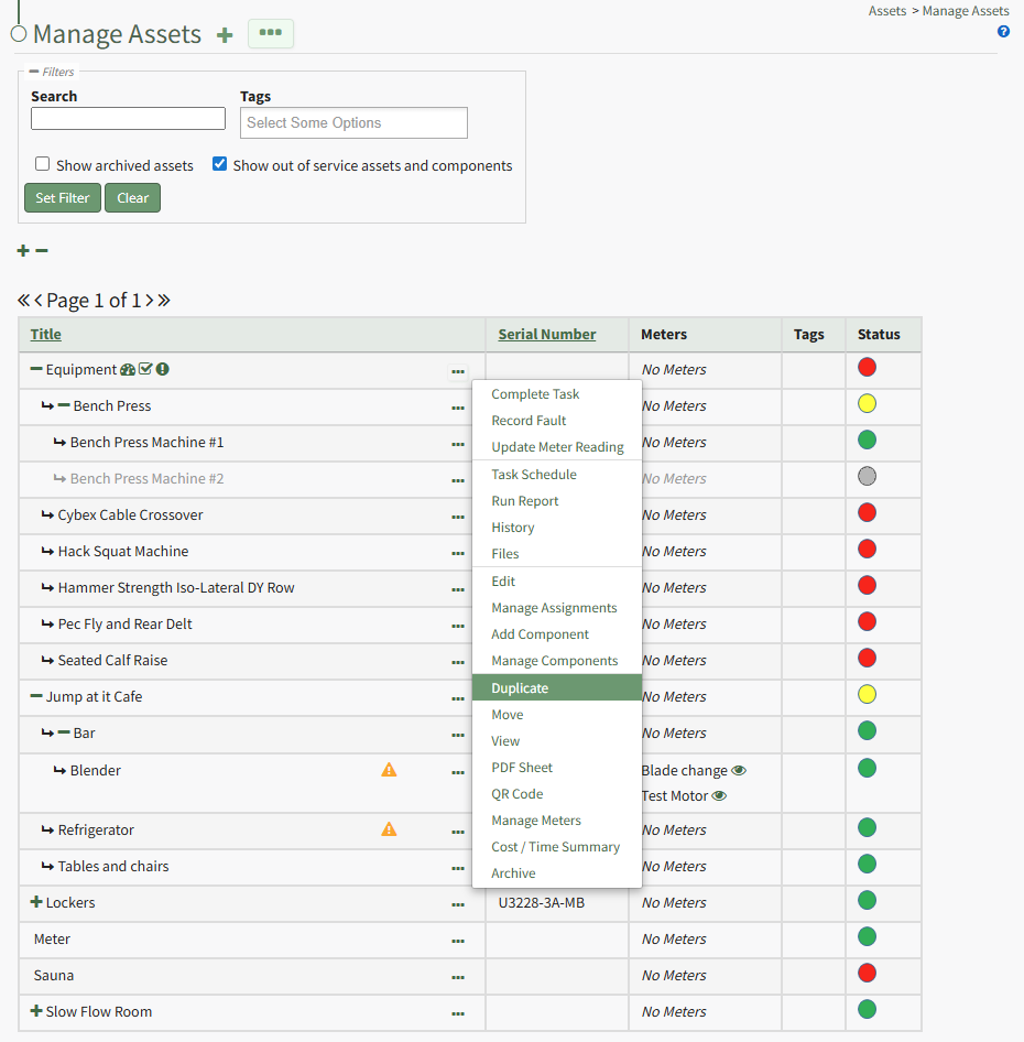 To copy and rename an asset, select Manage Assets from the Main Menu under the Asset Module. Use filters as needed and identify the asset/component you want to copy. Click the three-dot icon to the right of the asset title opening a context menu.