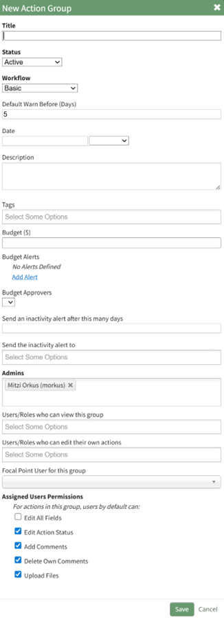 Budget ($) | Leave this blank if you do not want to generate a new budget in the Finance Module for the Action Group. Input a dollar amount to create the budget. |