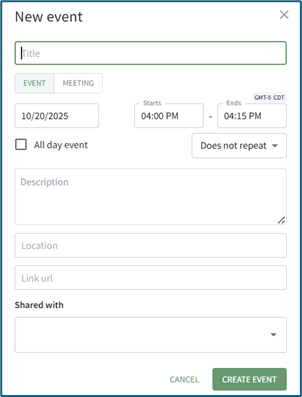 To create a new calendar event, open the Home Page of the Calendar Module.
